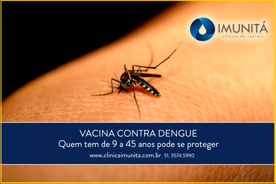 Aqui na Clínica Imutá já está disponível a vacina contra a dengue. Ela é aplicada em três doses, com intervalos de seis meses. Pode tomar quem está na faixa de 9 aos 45 anos de idade. Vale lembrar – é contra indicada para gestantes, mulheres em período de amamentação e pessoas em tratamento médico de doenças graves, a exemplo do câncer.